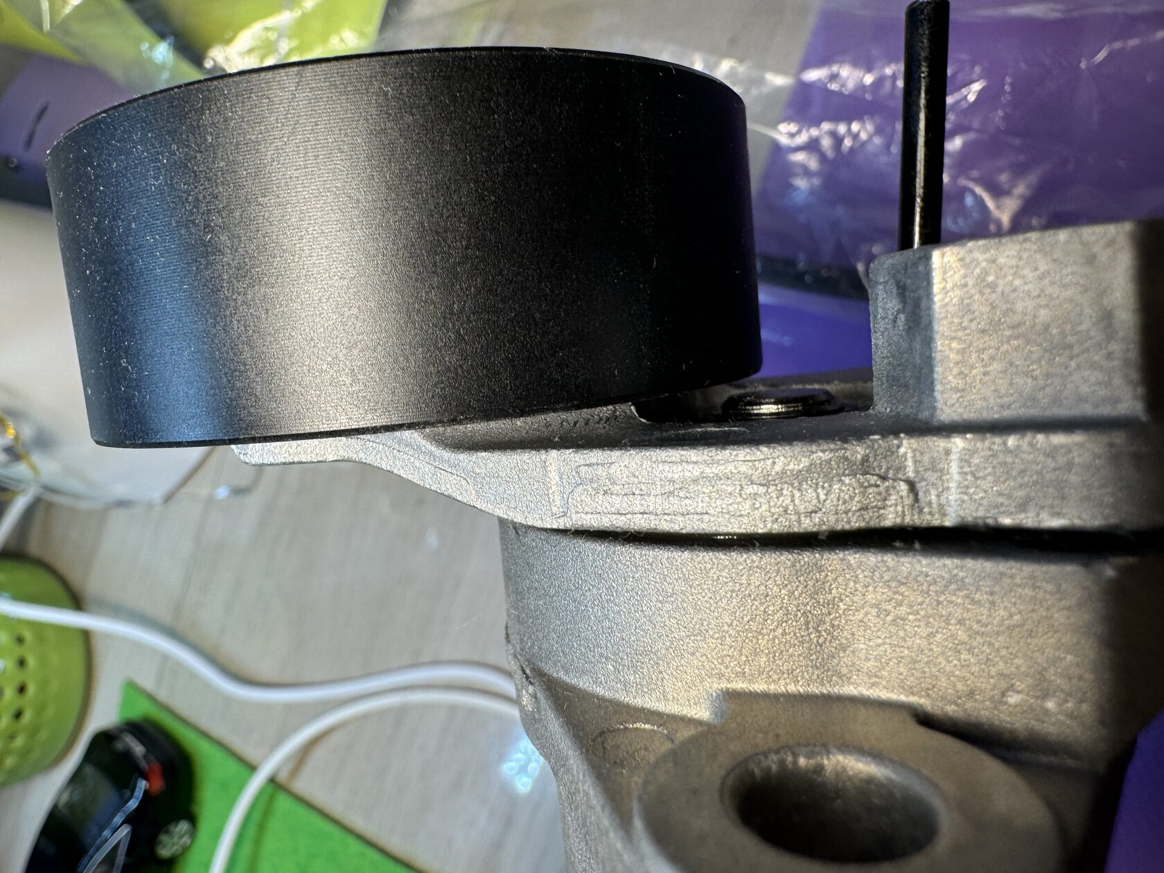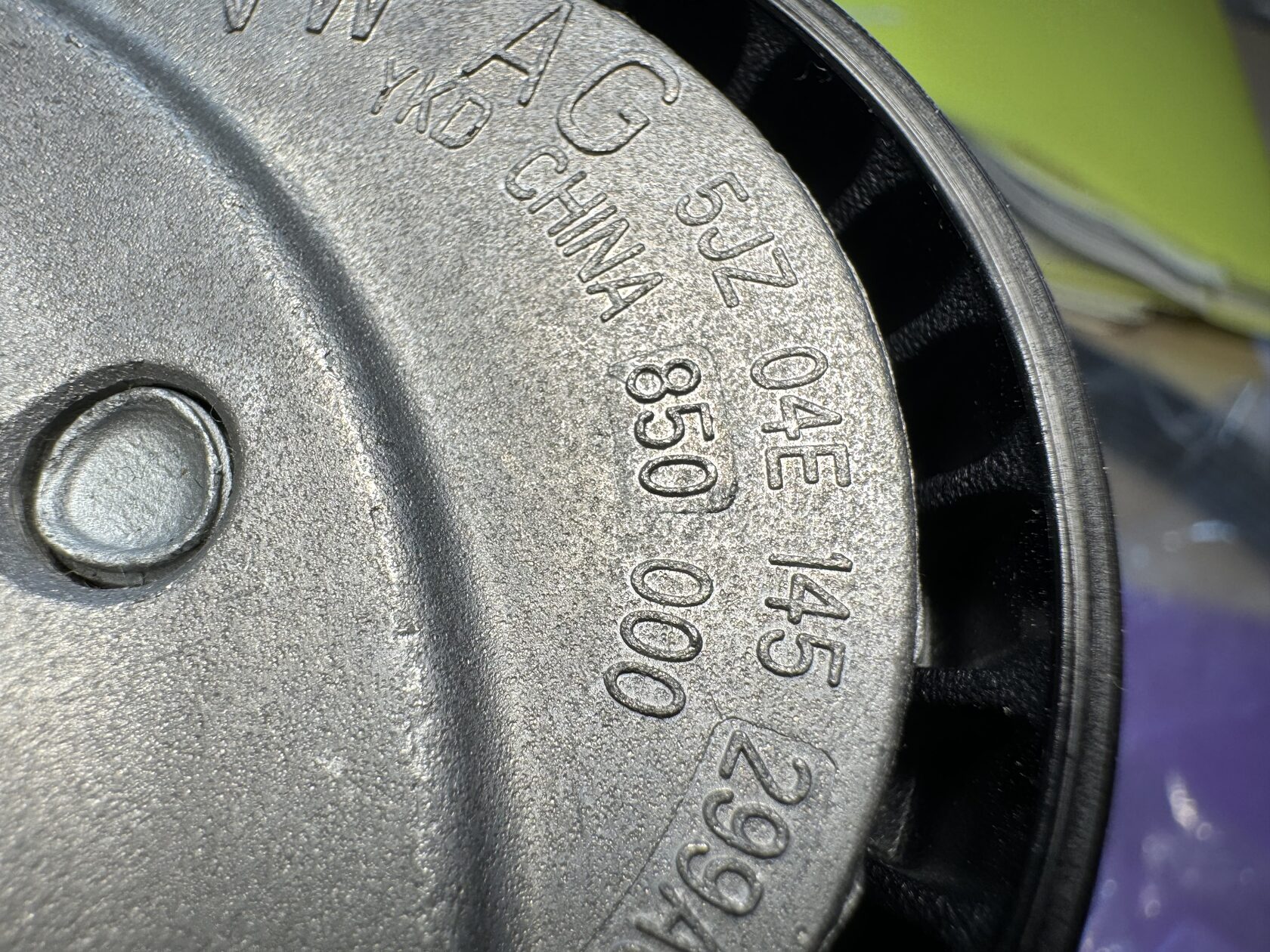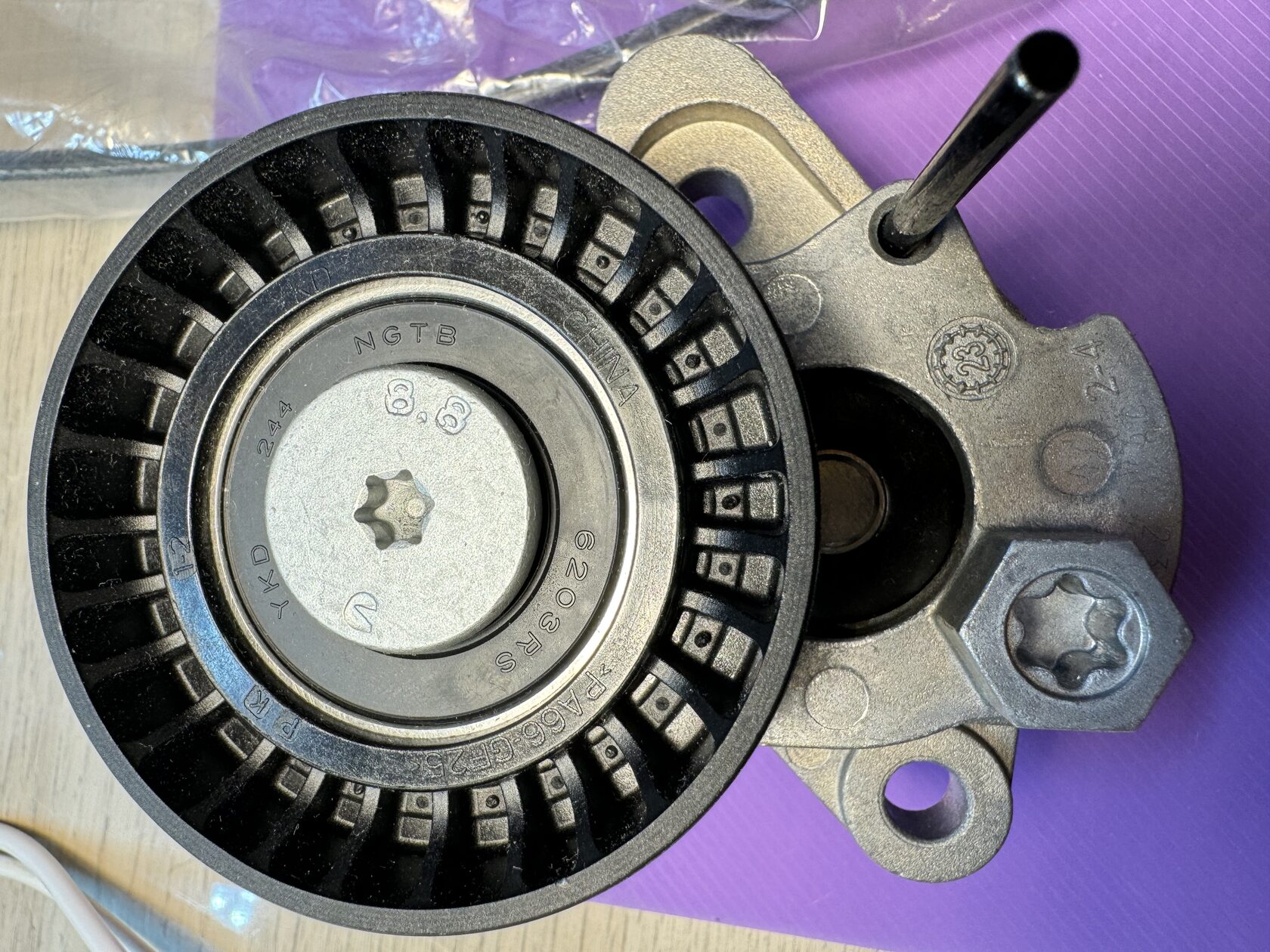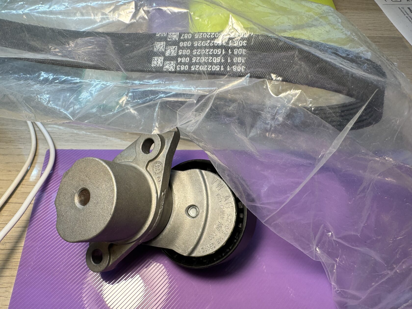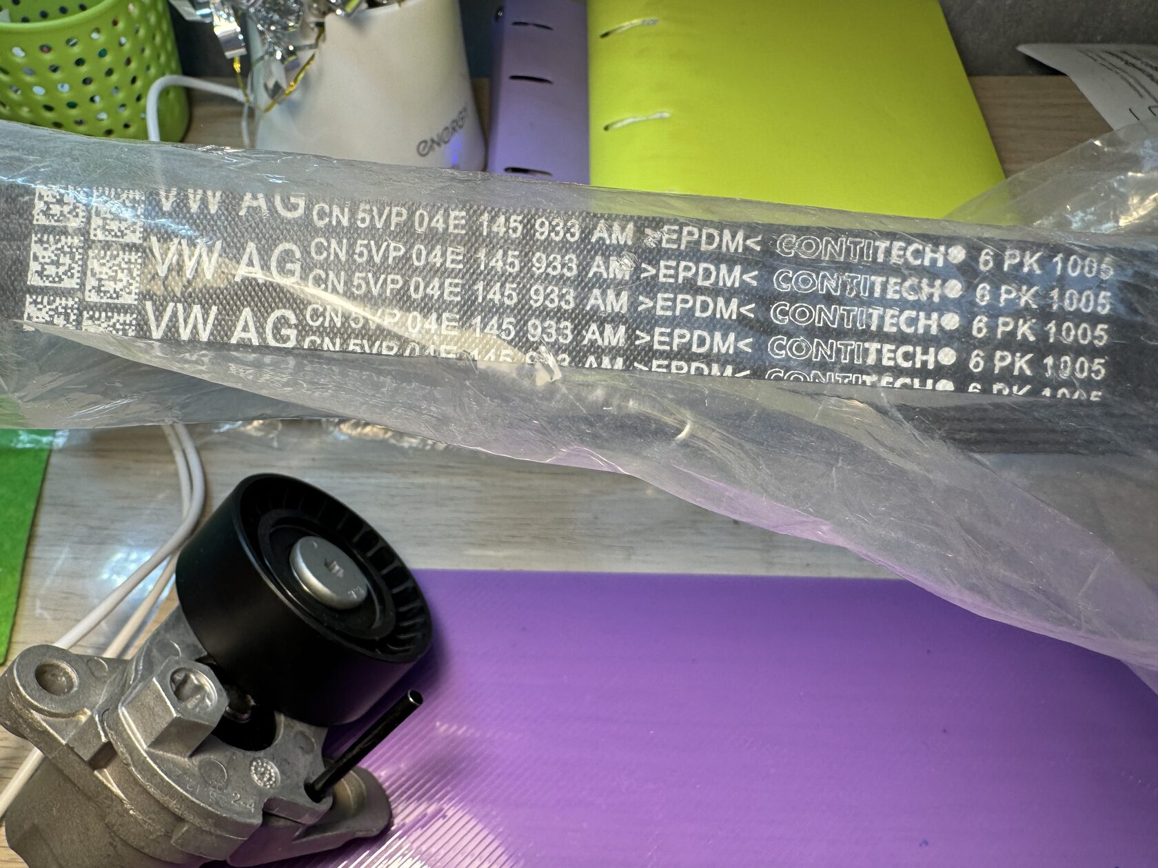 Оригинальный комплект ремень генератора (приводной поликлиновой ремень) и натяжитель с демпфером для VAG с моторами EA211 1.2 TSI, 1.4 TSI и 1.5 TSI; фотосессия во время сборки заказа. Артикул 04E1459